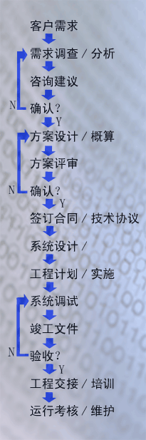 一般情况下我们将采取交钥匙的方式来完成所做的项目工程,其流程如图所示,我们会严格的管理各环节的运行。这样有利于避免因工程实施环节过程多,协调配合困难等原因困难带来的工期延误、投资增加、质量难以保证等问题,从而确保了用户的利益。